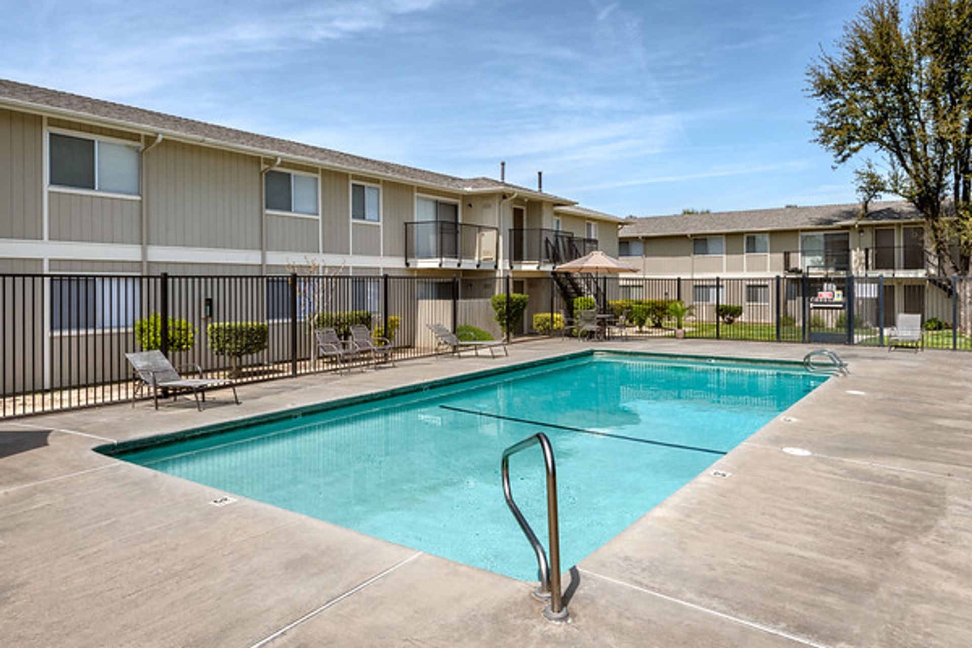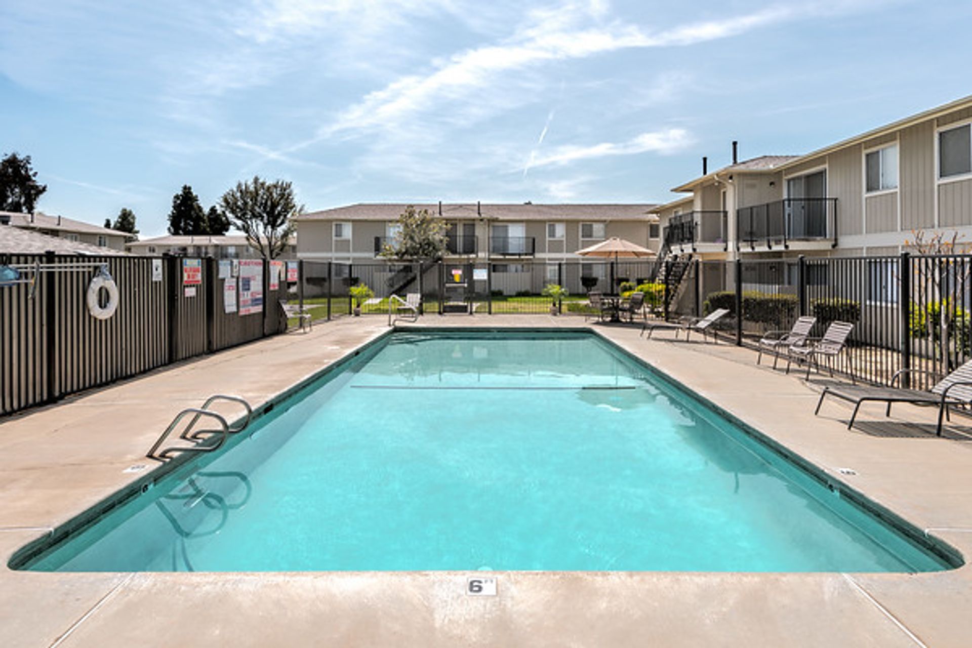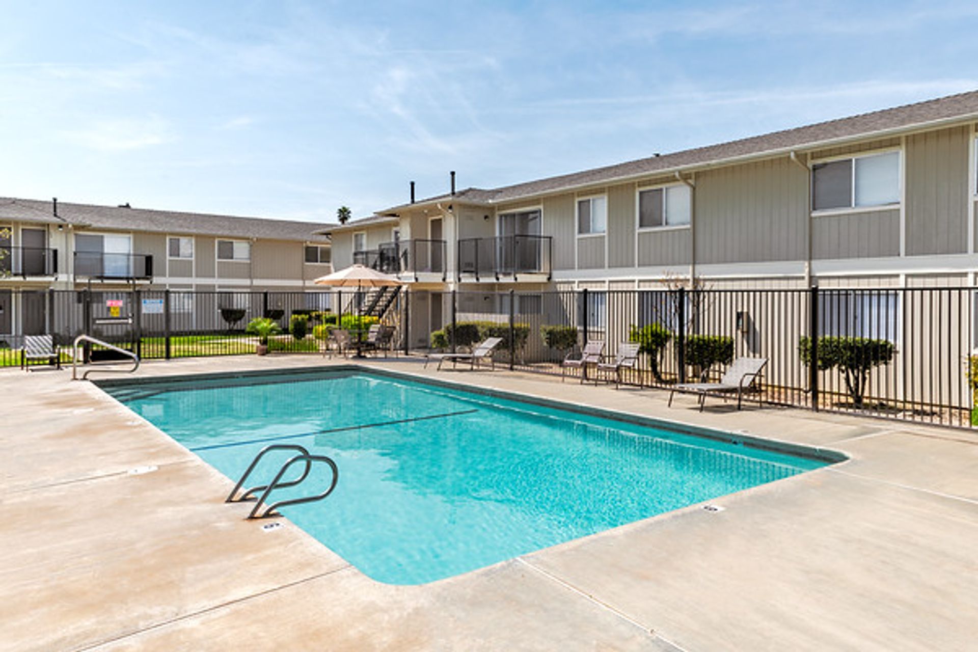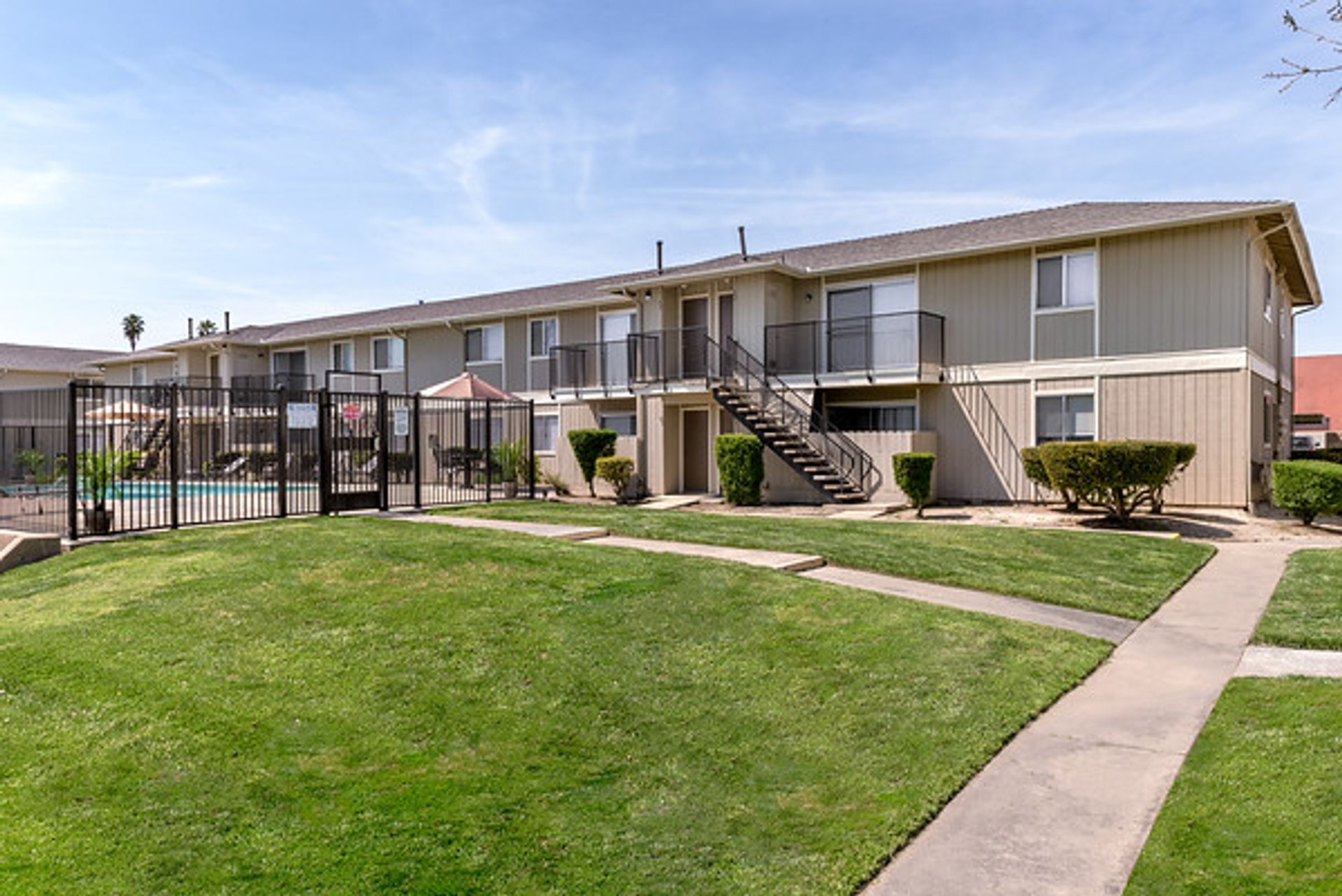 Apartment complex with a pool, grassy lawn, and fence on a sunny day.