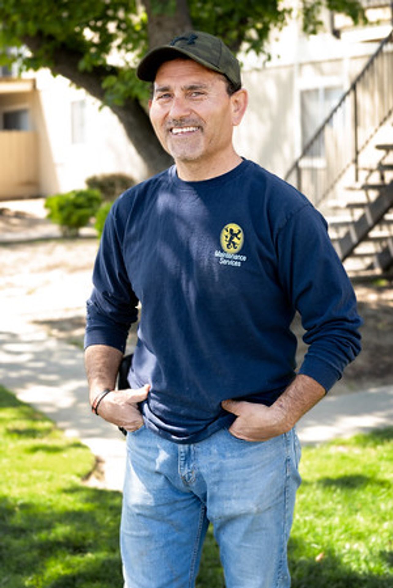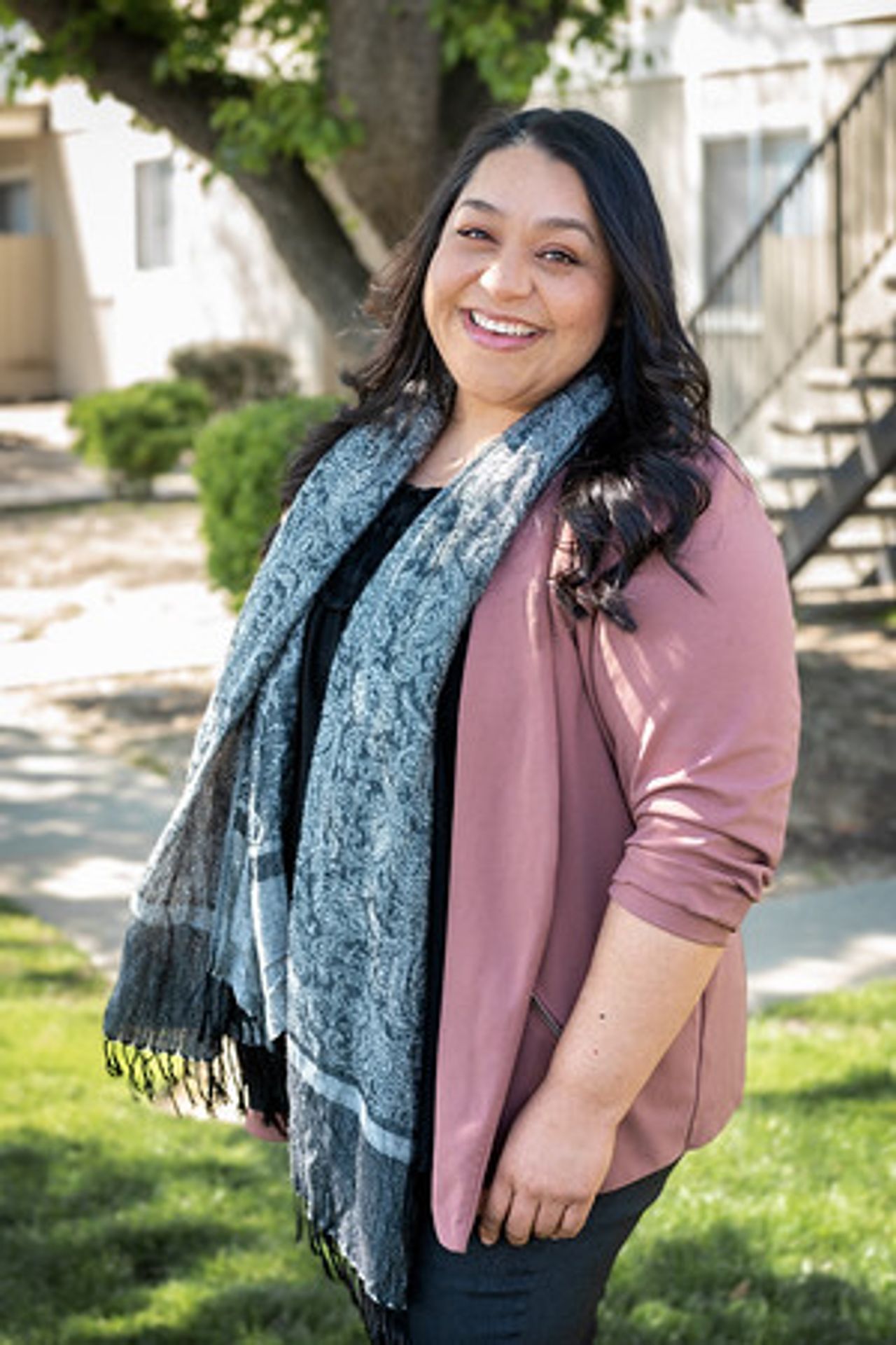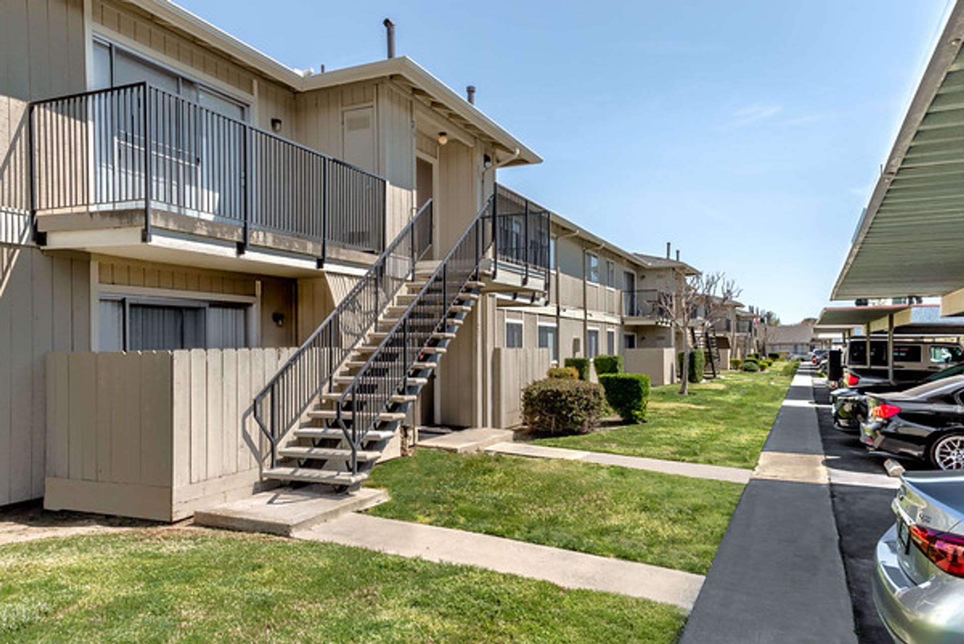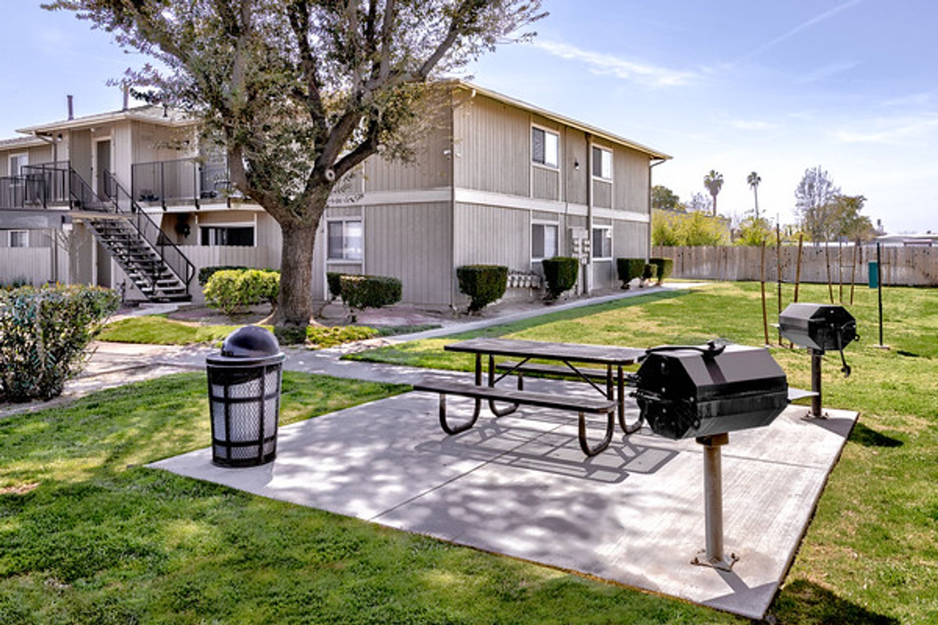 Apartment complex with a pool, grassy lawn, and fence on a sunny day.